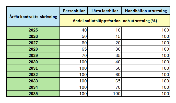 Nollutsläppsfordon/-arbetsmaskiner är här definierat som ett fordon eller en arbetsmaskin som under drift inte släpper ut koldioxid (oavsett fossilt eller biogent ursprung på elen). Samtliga entreprenader inom Göteborgs stad ska uppfylla fastställda krav avseende minsta andel nollutsläppsfordon/-arbetsmaskiner, i enlighet med nedanstående tabell.