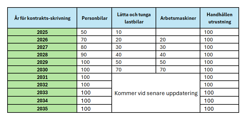 Utöver de krav som anges i ovanstående tabell avseende andel nollutsläppsfordon/-arbetsmaskiner kan följande tilläggskrav komma att tillämpas, i enlighet med nedanstående tabell. Denna tabell ersätter därmed ovanstående tabell.