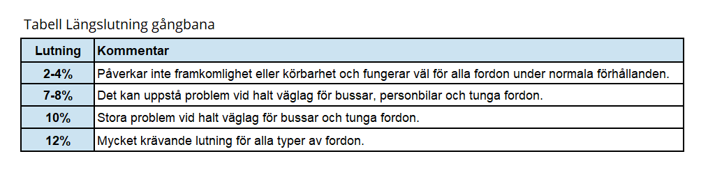 Nedan ges en indikation på hur motorfordonstrafik påverkas av olika lutningar.