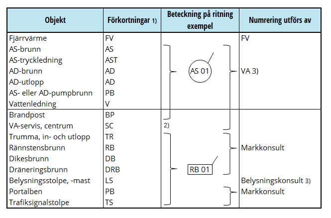 Punkter som avser stolpar och brunnar numreras med ett namn som börjar på två bokstäver följt av ett löpnummer. Namnet får ej innehålla blanktecken. I den fyrkantiga nummersymbolen, se nedan, bör det däremot vara ett ”mellanslag” för tydlighetens skull.