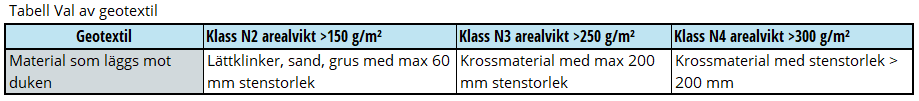 Geotextilen väljs därför, med hänsyn till det grövsta material som läggs mot densamma, enligt följande tabell: