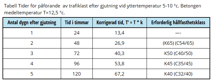 Tider för påförande av trafiklast efter gjutning