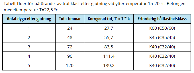 Följande tabeller anger den hållfasthetsklass som krävs för att uppnå en hållfasthet av 20 kPa inom 1, 2, 3, 4 respektive 5 dygn, för två olika temperaturalternativ. Det är alltså möjligt att erhålla en hållfasthetstillväxt som är snabbare än den för K45 (C35/45) genom att välja en högre hållfasthetsklass. De högre hållfasthetsklasserna utvecklar större mängd värme under hydratationen vilket kan leda till problem med temperaturspänningar i tvärsnittet. Praktisk användning har hållfasthetsklasserna K40 – K60 (C32/40-C50/60) mht temperaturutveckling.