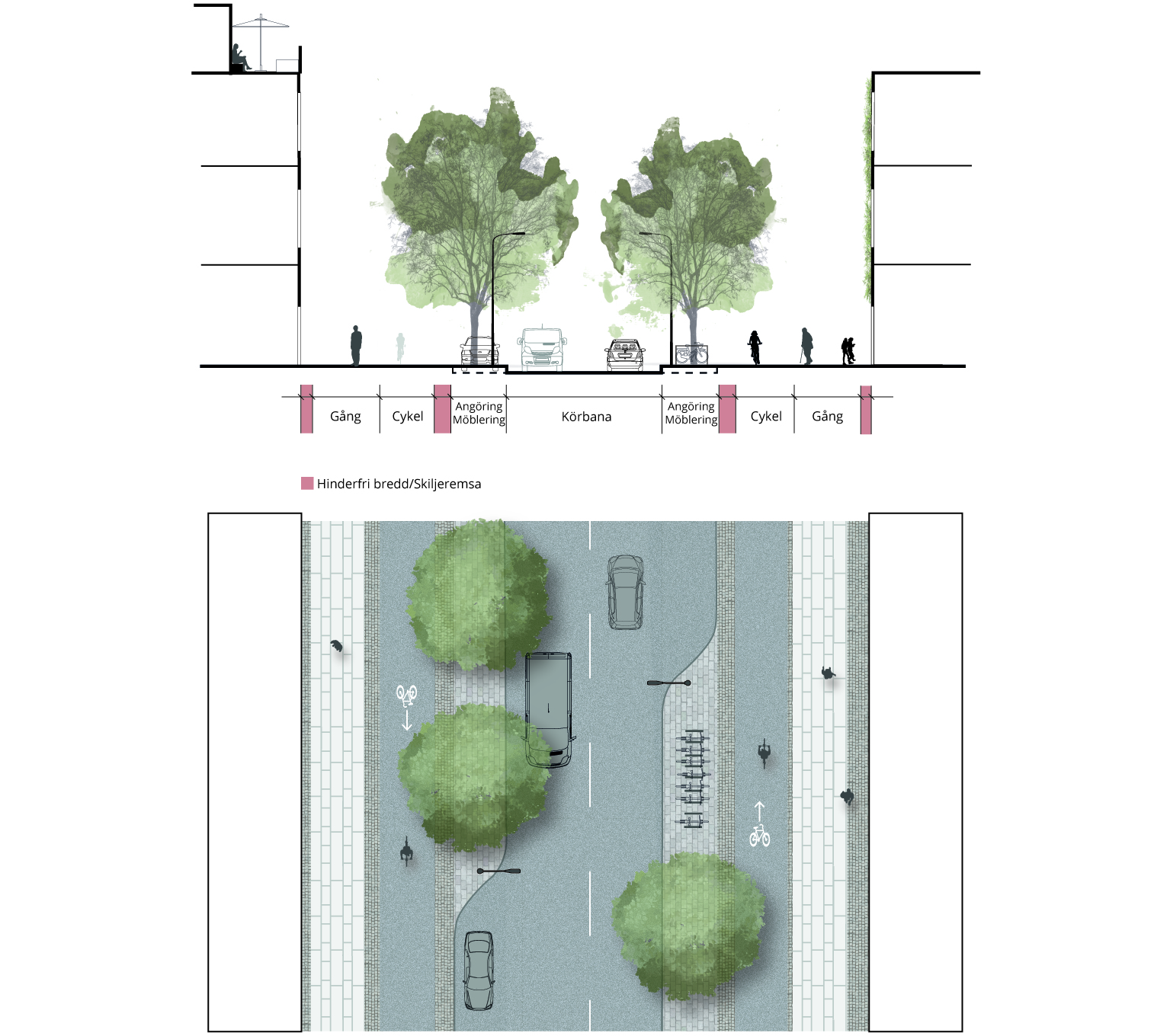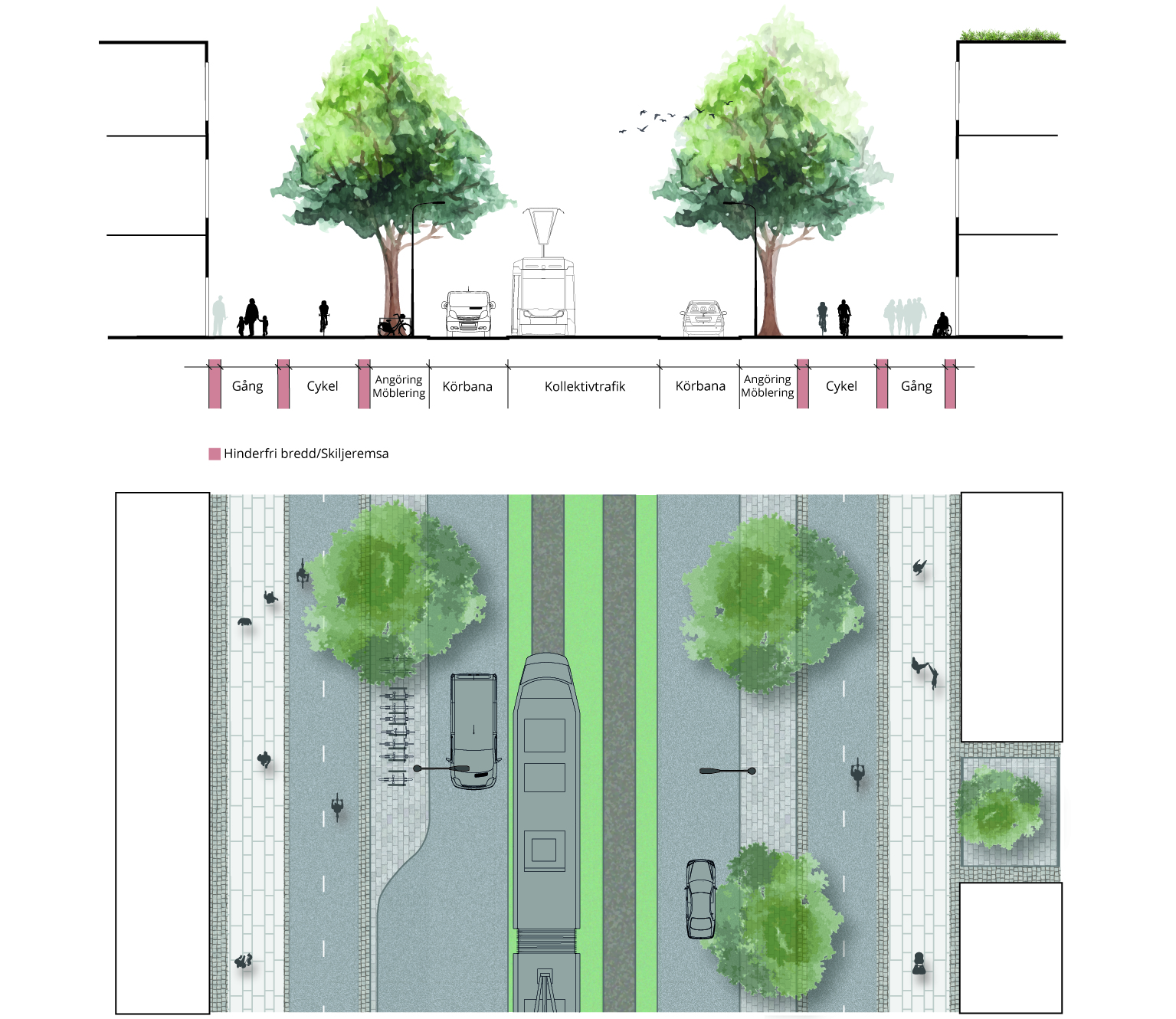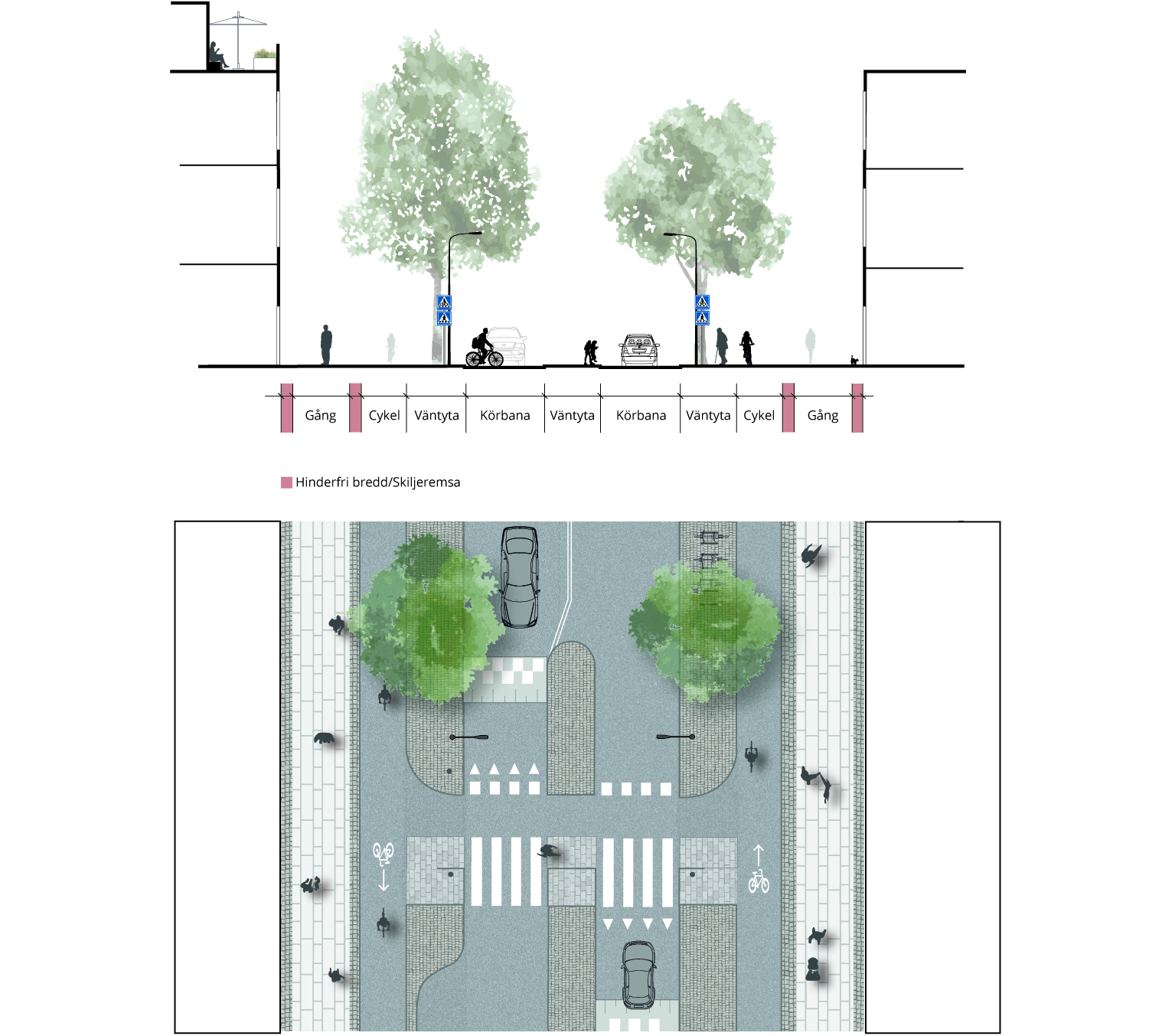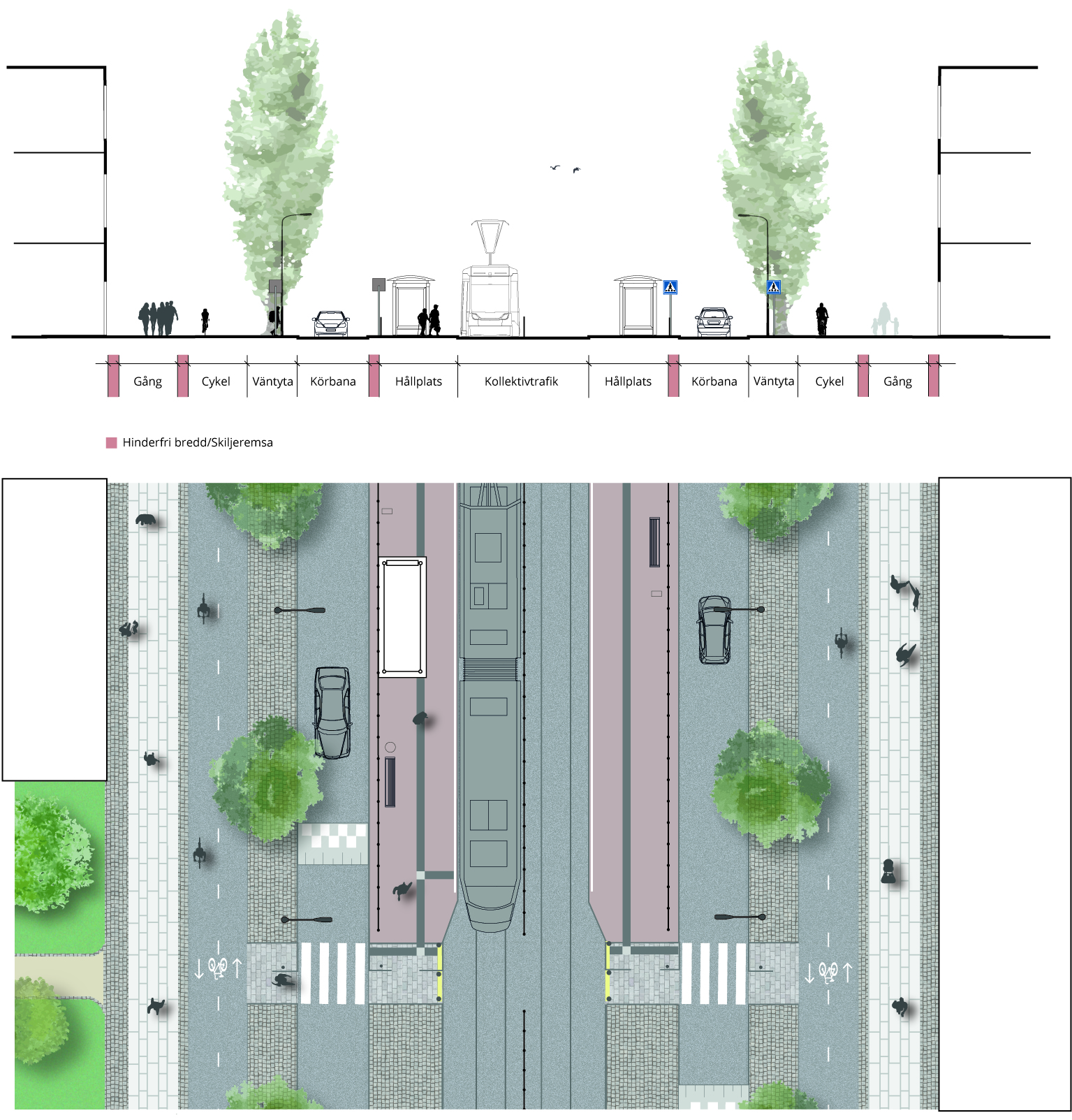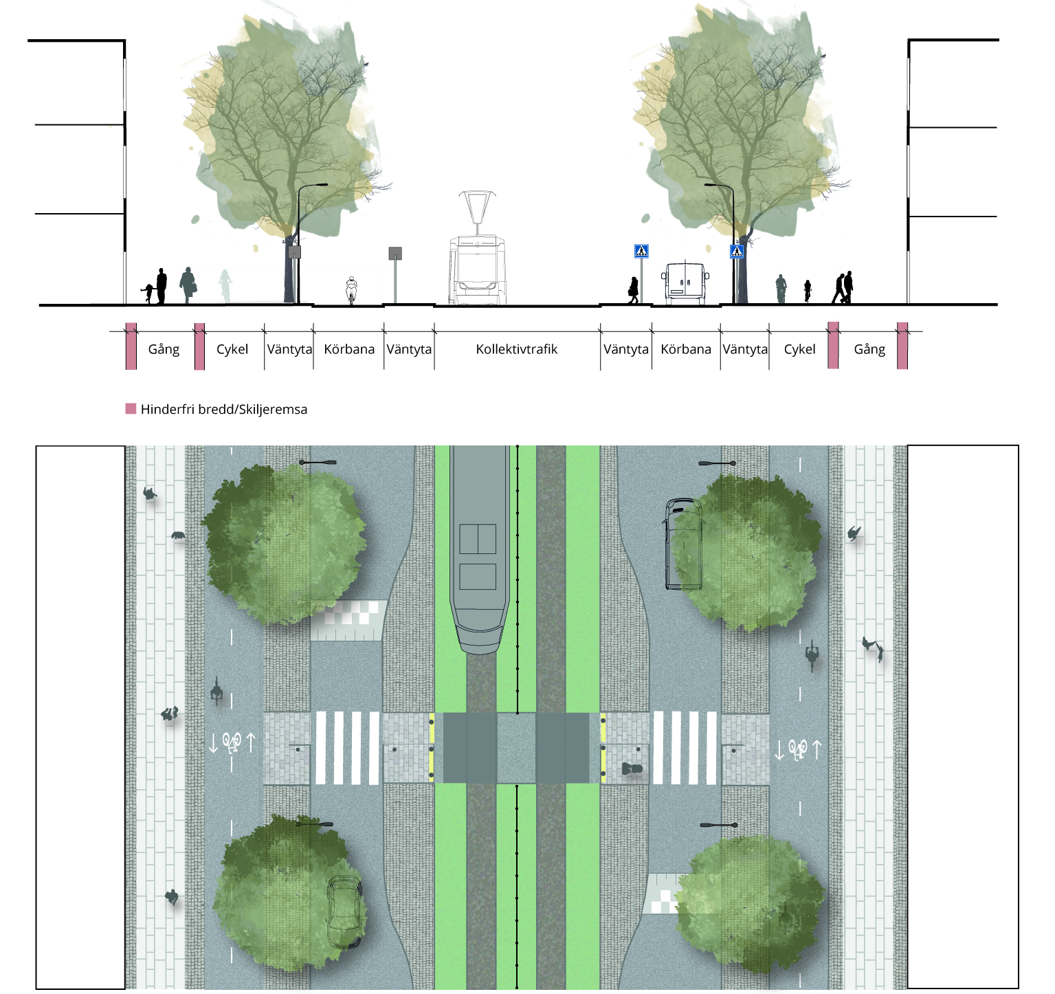 Exempel på huvudgata med spårväg i eget utrymme vid övergångsställe