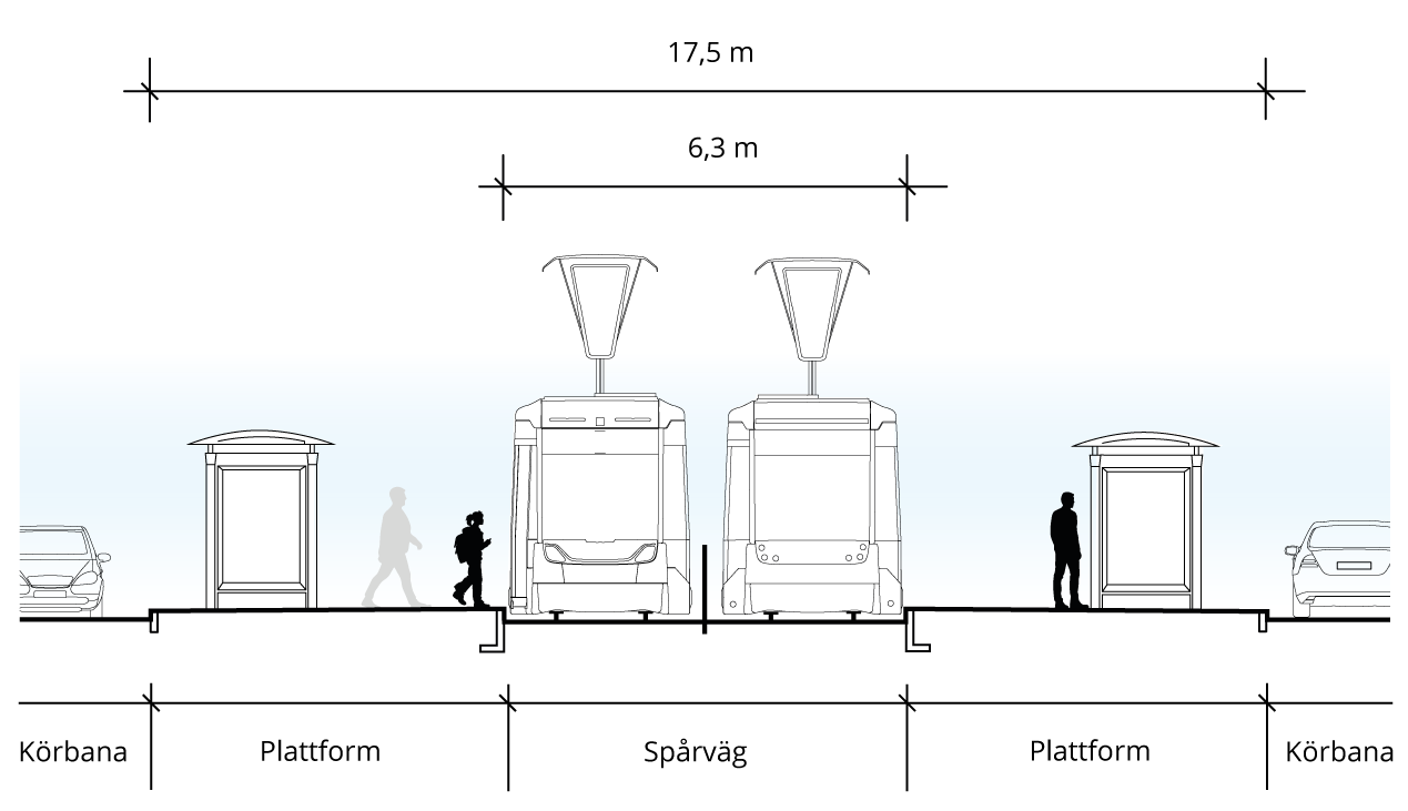 Principsektion för spårvagnshållplats med plattformarna placerade mittemot varandra och körbana bakom.