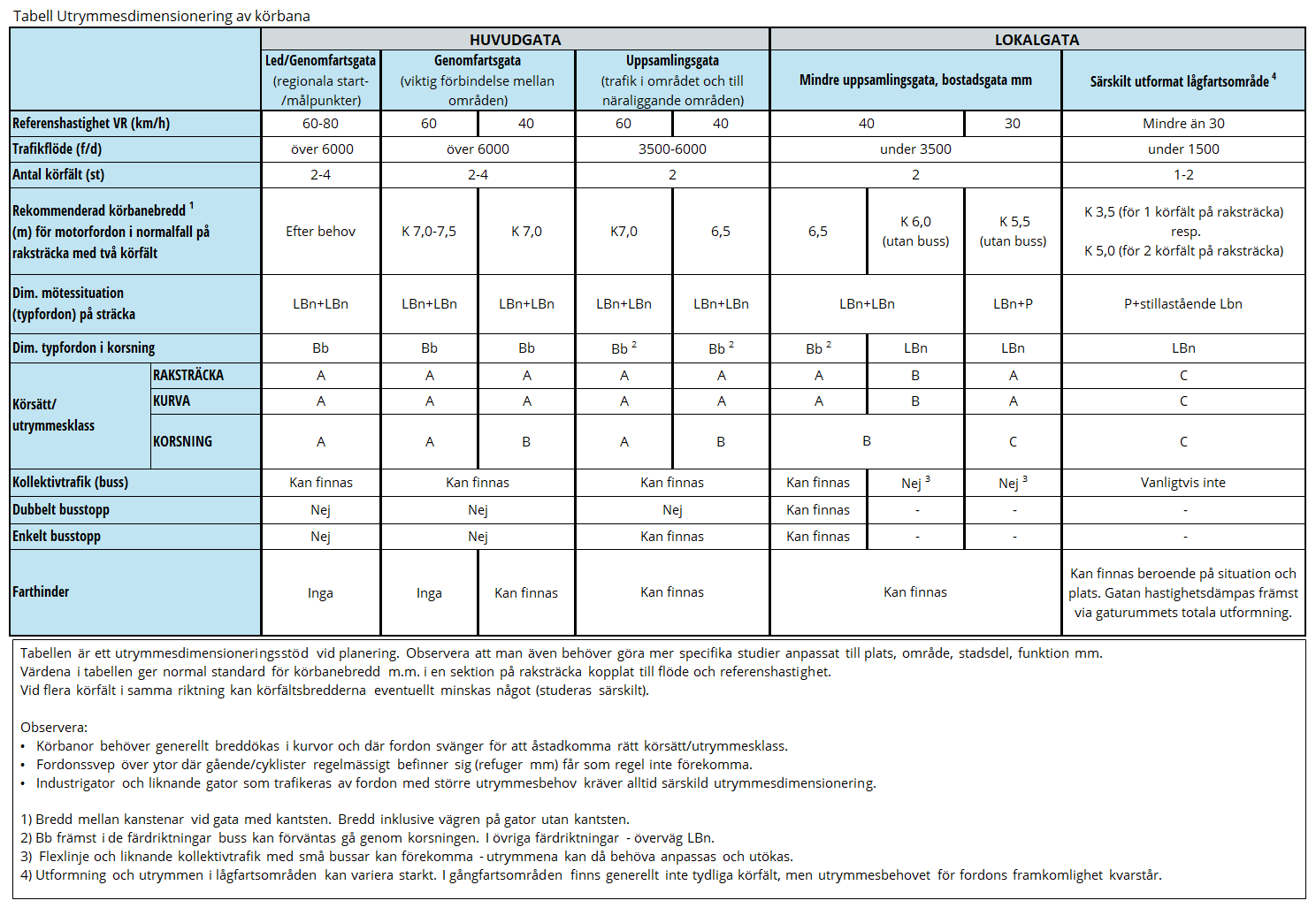 För att farthinder ska kunna anläggas måste vissa förutsättningar vara uppfyllda, se tabell ”Utrymmesdimensionering körbana”. På det större vägnätet med högre hastigheter och stora anspråk på framkomlighet är inte farthinder aktuellt medan det på det mindre gatunätet ofta är en förutsättning för en säker och trygg trafik för olika trafikanter. På gator som trafikeras av kollektivtrafik i linjetrafik ska kollektivtrafikanpassade åtgärder väljas. För mer information se beskrivningar av olika typer av åtgärder som kan användas.