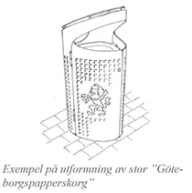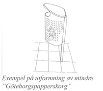 Generellt bör två storlekar av ”Göteborgsmodellen” på papperskorg användas på gator, torg och i parker inom Vallgraven. Det finns dock platser undantagna från denna regel som till exempel platser med stark historisk förankring. Vid Gustav Adolfs Torg används till exempel en sandgjuten aluminiumpapperskorg med Göteborgs vapen.