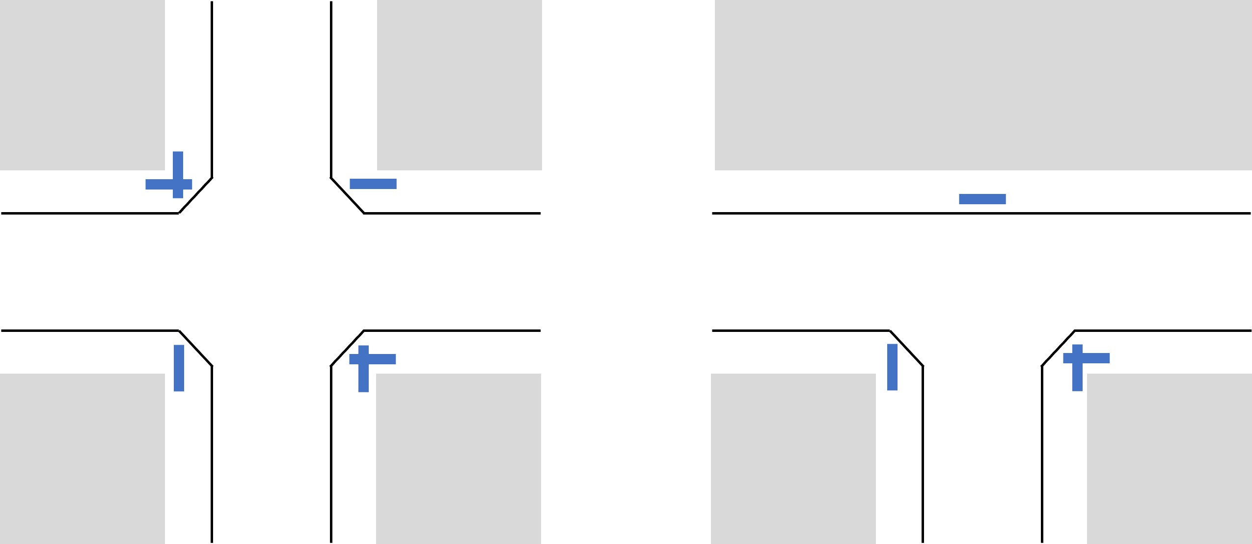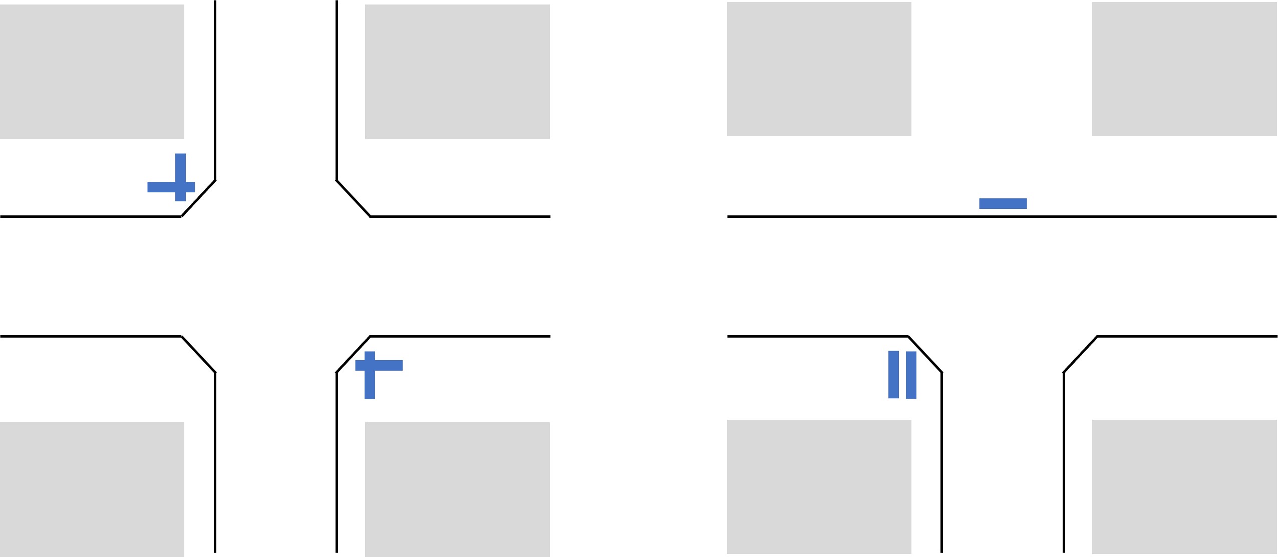 - När två gatunamnsskyltar monteras på samma stolpe skall de monteras under varandra, i riktning utefter gatorna.