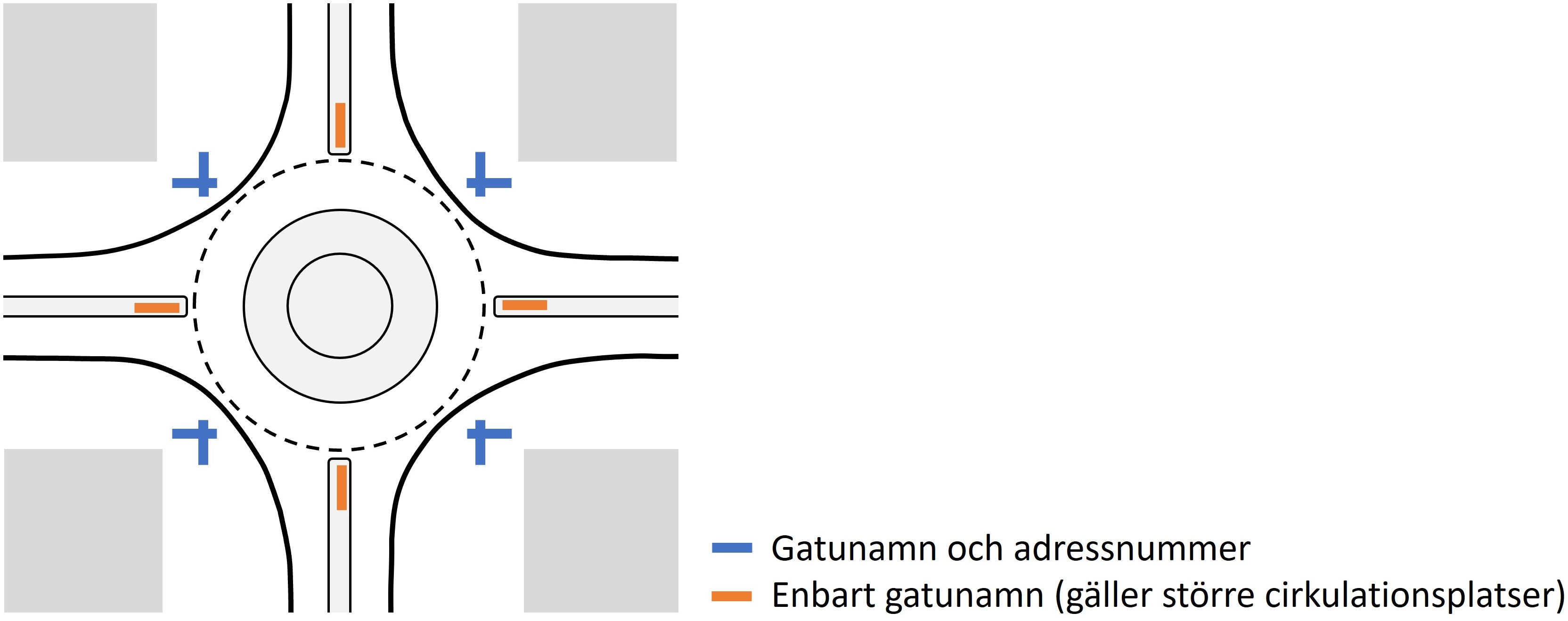 - I större cirkulationer placeras gatunamnsskyltar i refugerna, gatunamnet sätts då upp utan adressnumrering. Om adressnumrering vid gatorna ut från cirkulationsplatsen behövs, kompletteras med skylt vid gatan på vanligt sätt.