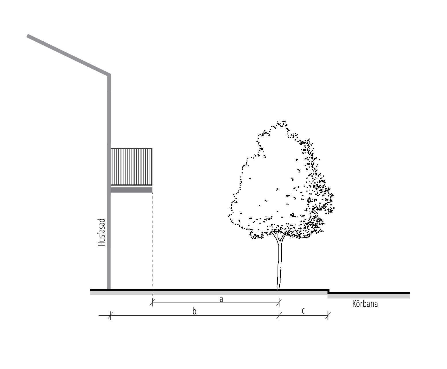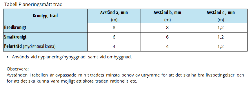 Placering av träd ska alltid uppfylla kraven på hinderfri bredd och säkerhetszon och ska inte placeras siktskymmande.