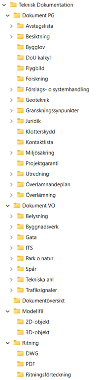 - Rubrikerna i 12CF1 Dokumentationskrav för Teknisk dokumentation (Relationshandlingar) med underkapitel överensstämmer med mapparna i mappstrukturen och de gråa rubrikraderna i dokumentöversikten. Om det i rubriken står ett förkortat namn inom parentes så har det namnet kortats ner i mappstrukturen för att undvika att sökvägen blir för lång, exempelvis DoU-instruktioner. För mer information se 12CF1 Dokumentationskrav för Teknisk dokumentation (Relationshandlingar).